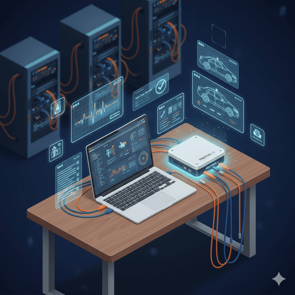 Traditional HIL systems are large and costly during initial development. The PROTOS miniHIL solves this by offering a compact, affordable solution that fits right on a developer’s desktop. It combines a hardware board with a powerful software platform for environmental simulations and automated test cases allowing developers to validate their applications after every code change.